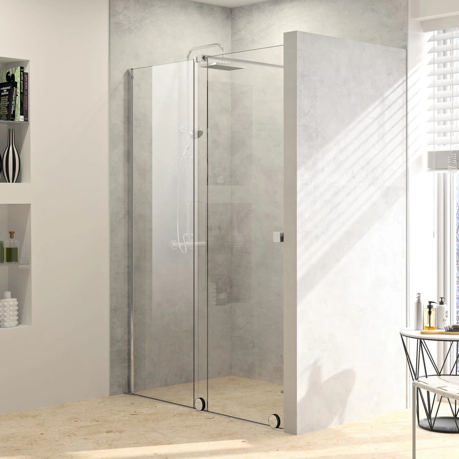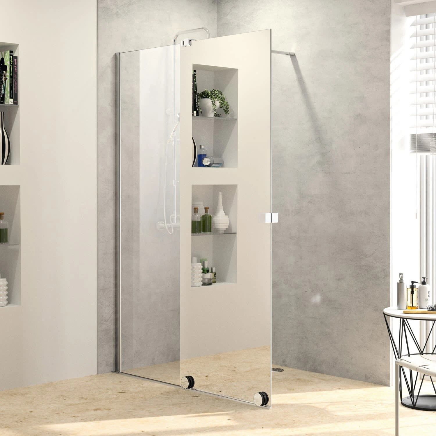 - teilgerahmte Walk-In mit einem Gleittürsegment, nach einer Seite öffnend, mit einem teilgerahmten festen Segment